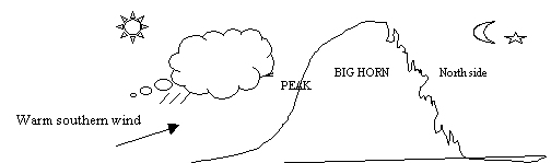 summer time, warm air and moisture travel to the south side of the mountain. Due to its high elevation, the mountain blocks those entire warm air and moisture from going