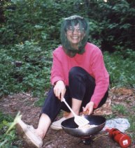 Adirondack LojMarjorie cooking (Hi, Marj, please keep those mosquitos out of the dish, would you?)